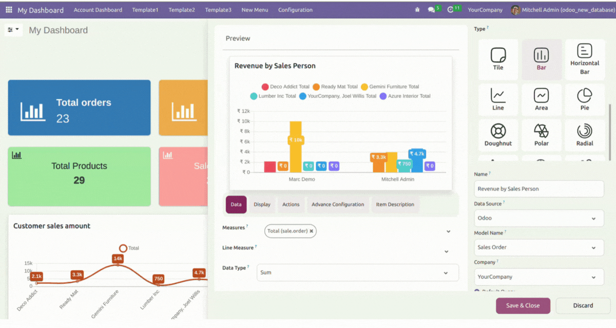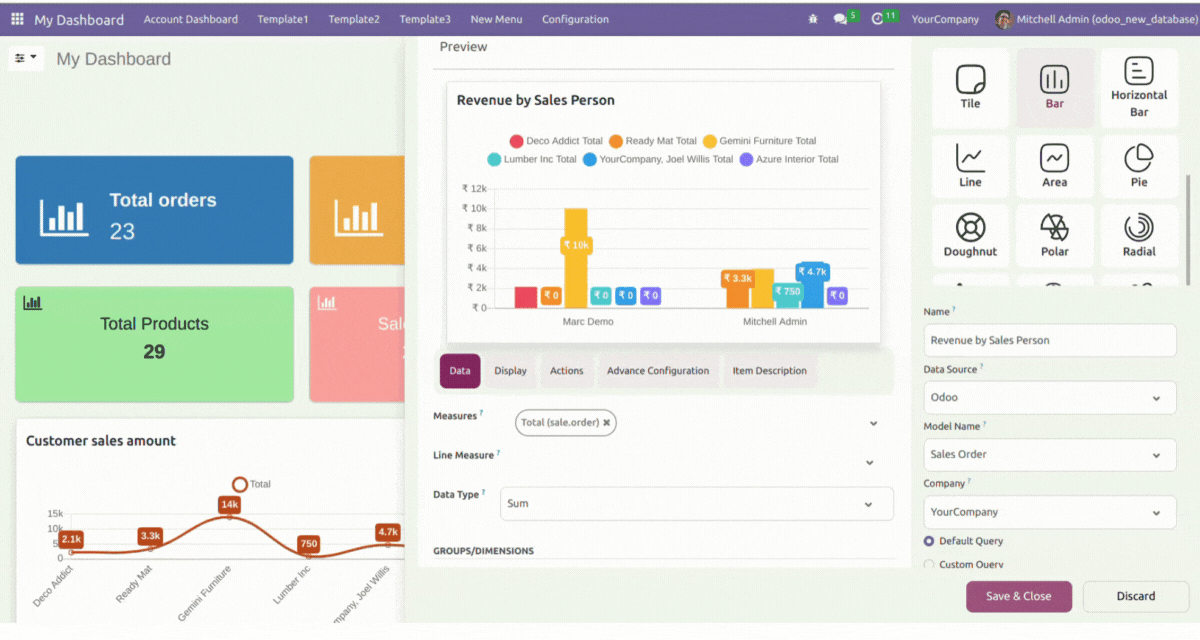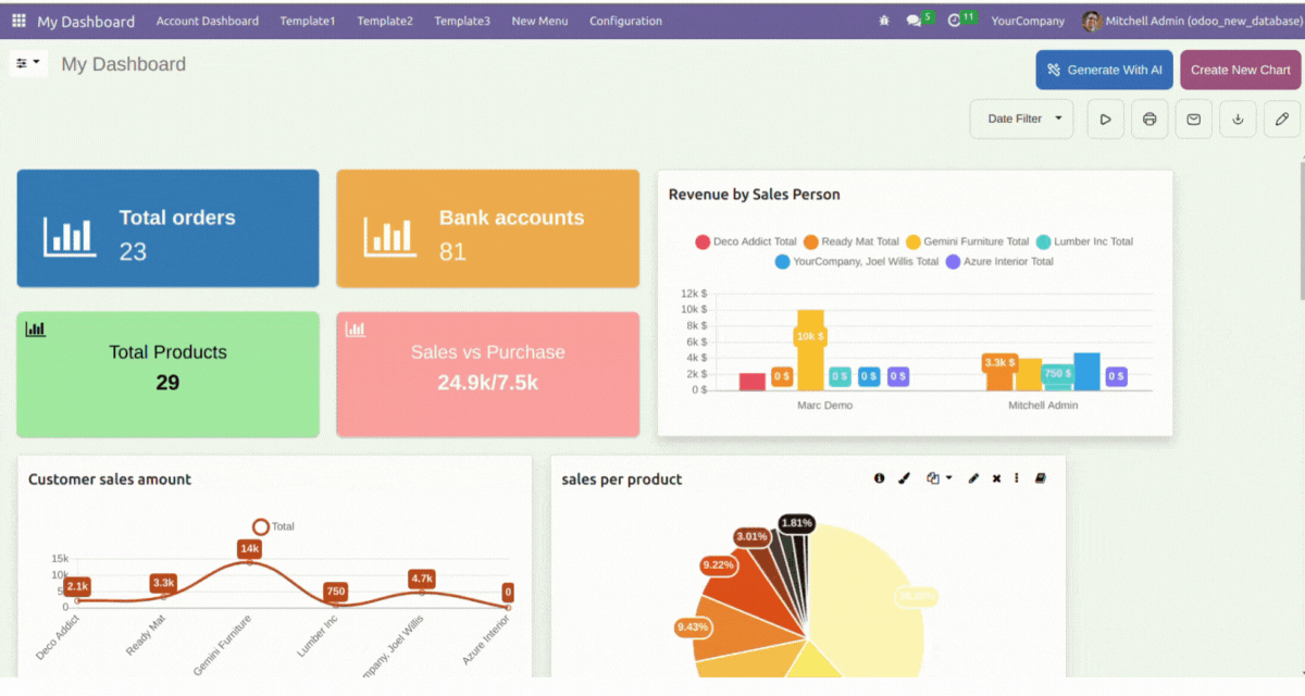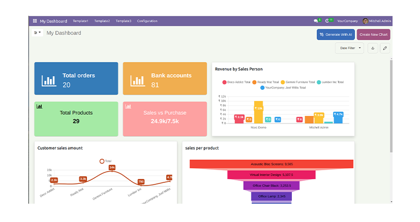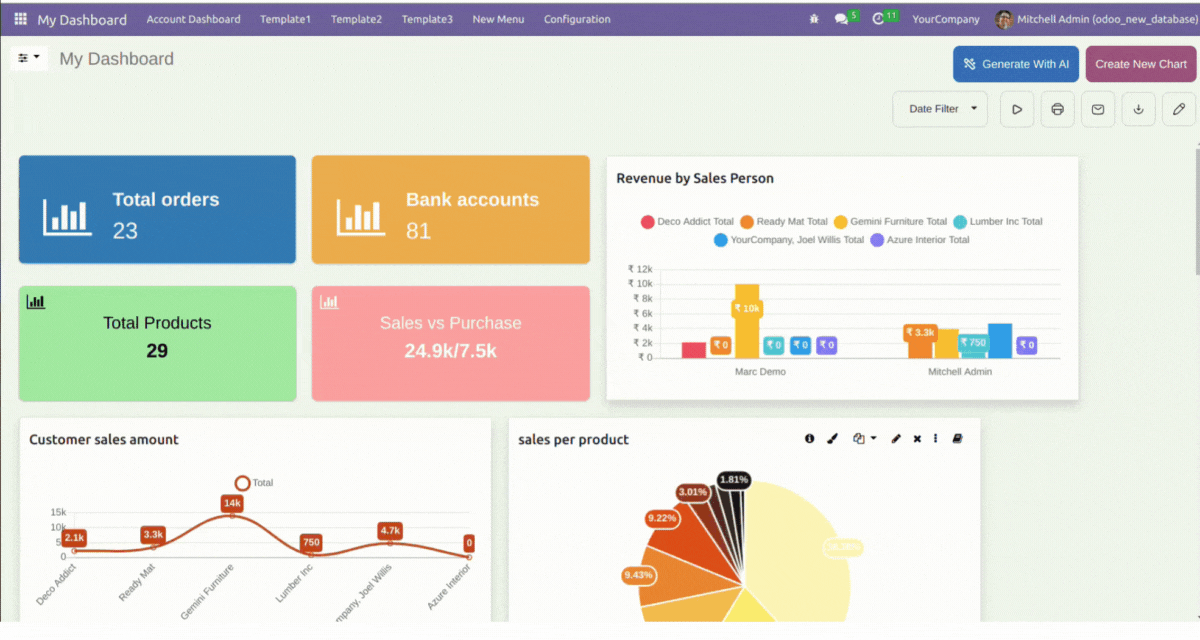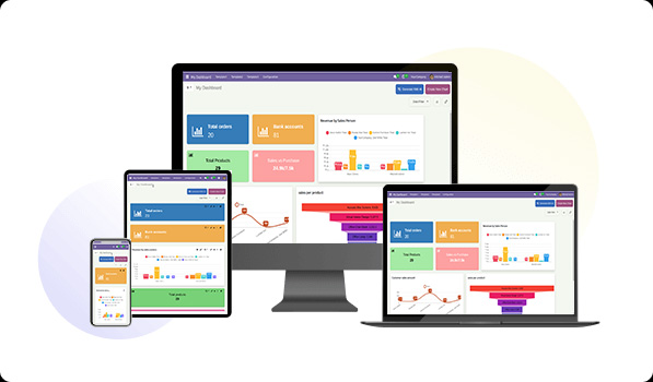 5 Predefined dashboards are provided for different verticals of a company(Sales, CRM, Account, Inventory, & POS). Customize them as per your need.