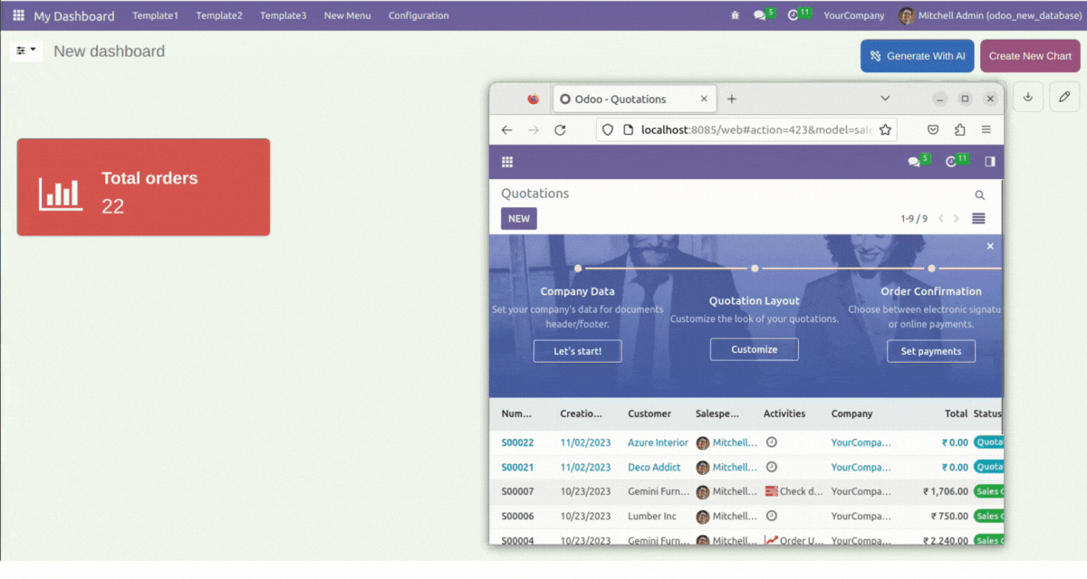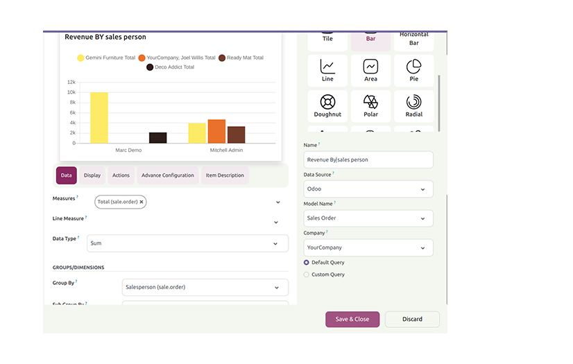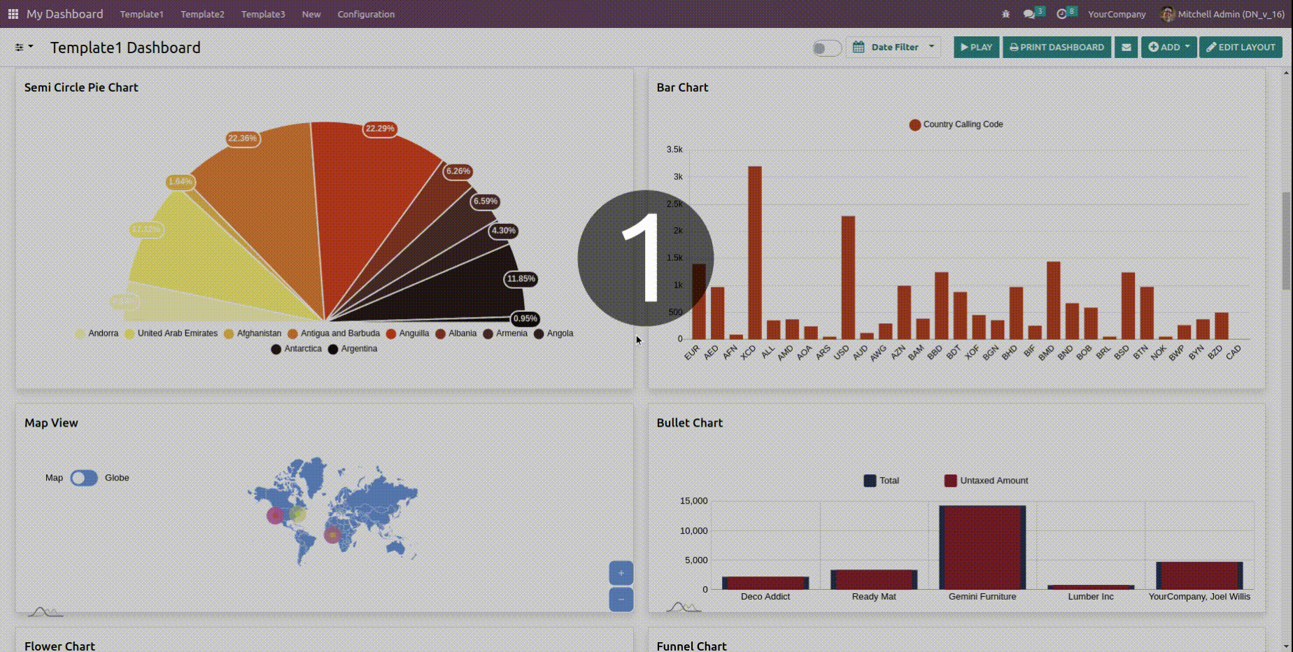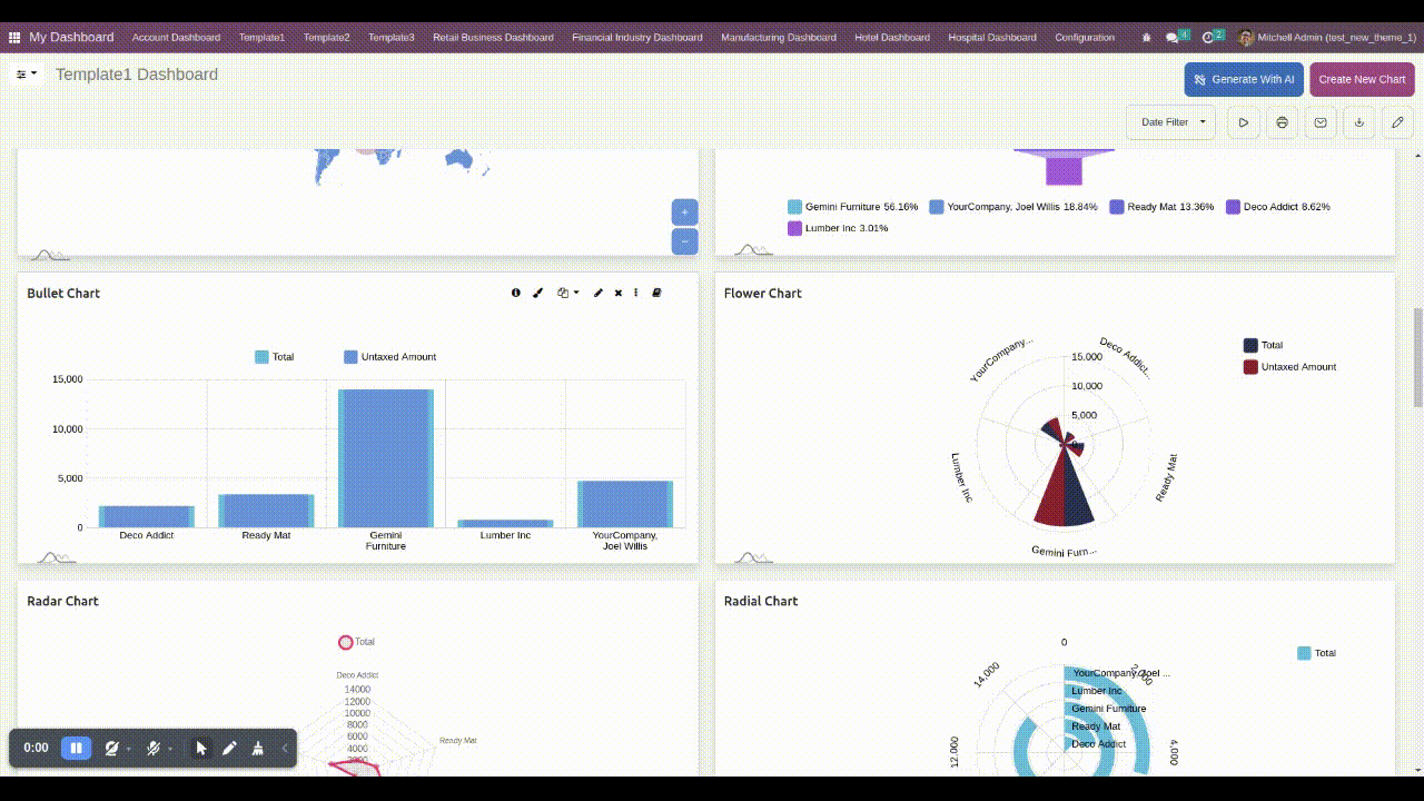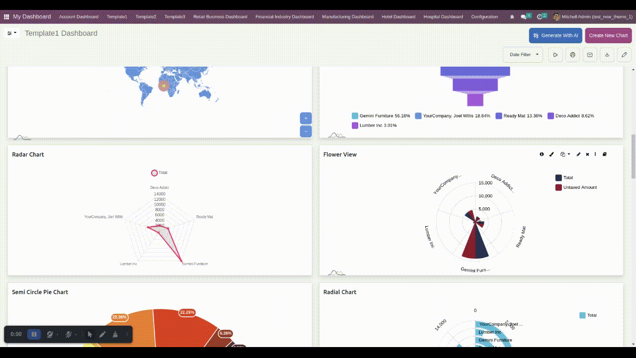 5 Predefined dashboards are provided for different verticals of a company(Sales, CRM, Account, Inventory, & POS). Customize them as per your need.