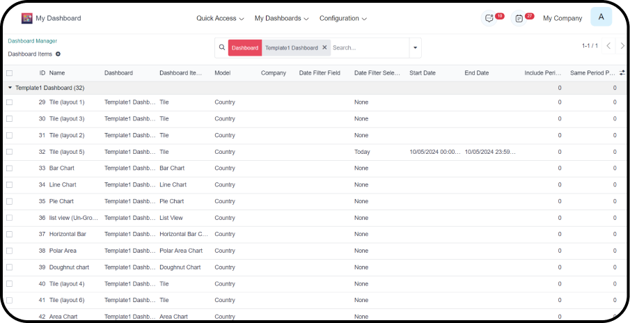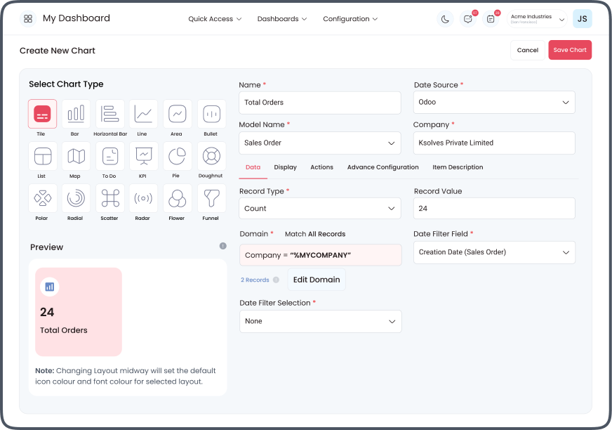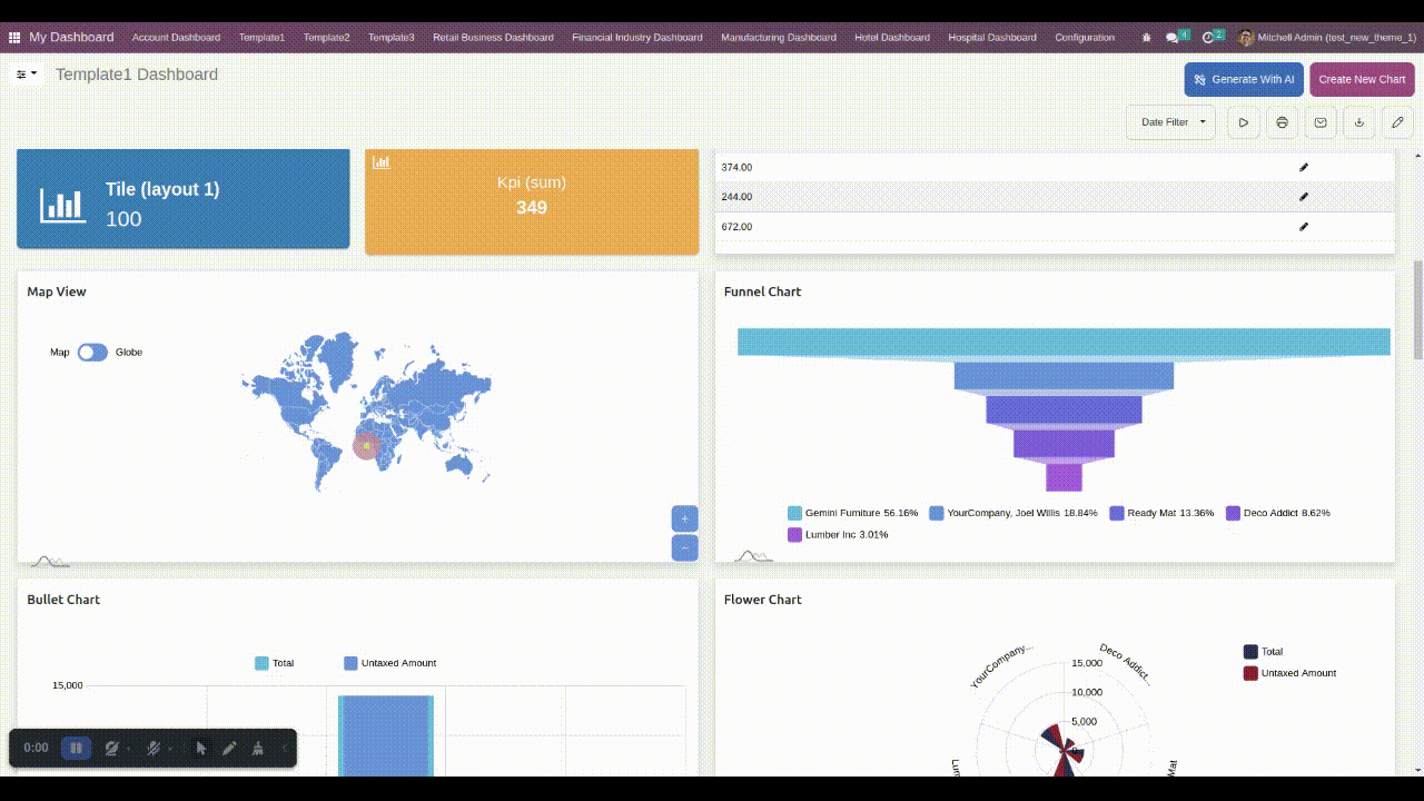 Supports 17 impressive Odoo dashboard item types for easy business data interpretation. (Tiles, Line Chart, List View, Bar Chart, Horizontal Bar Chart, Area Chart, To-do Item, Polar Area Chart, Pie Chart, Doughnut Charts, Flower Chart, Funnel Chart, Radial Chart, Radar Chart, Scatter Chart, Bullet Chart & Map view)