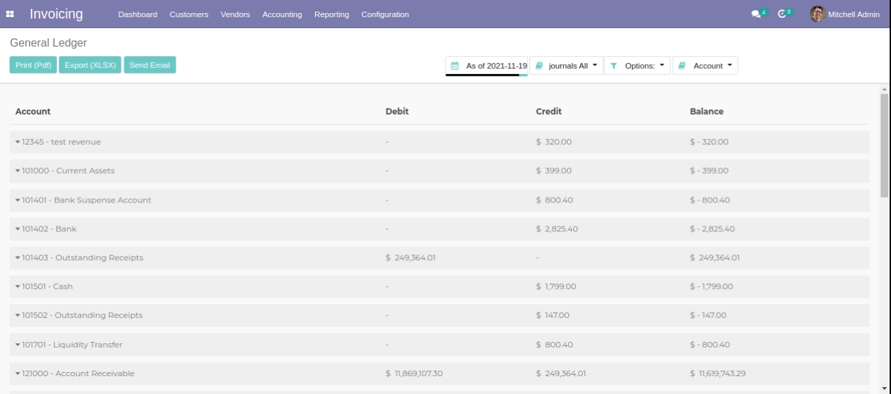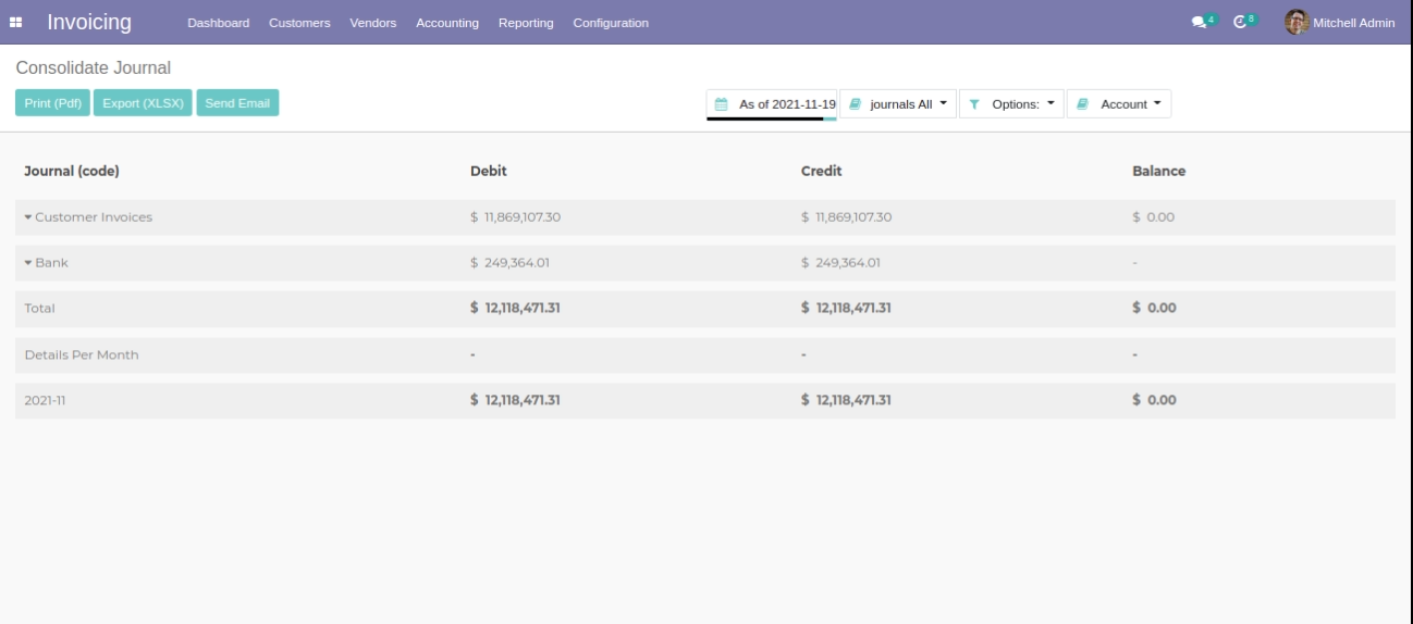 - The Journals All button provides the option to filter the report based on Bank, Cash, Cash Basis Taxes, Customer Invoices, Exchange Difference, Miscellaneous Operations, Vendor Bills.