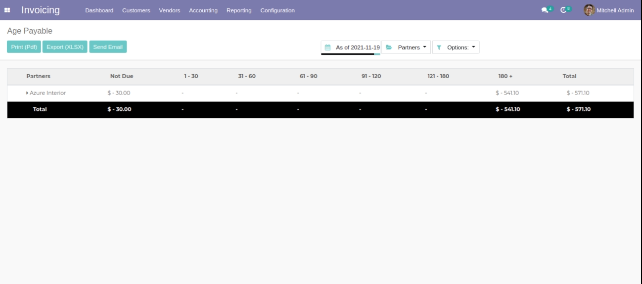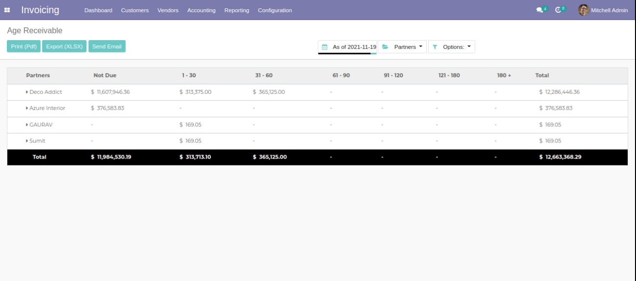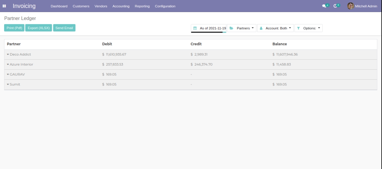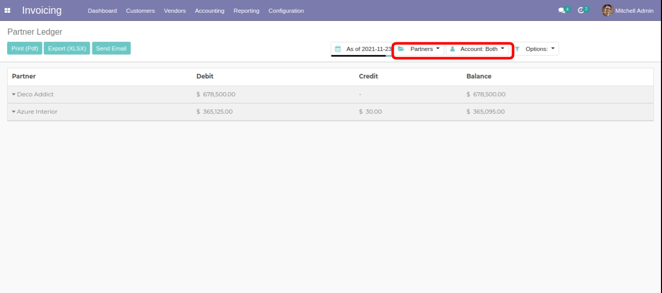 - Partner Filter : One can enter the name of the partner in the Partner Search button and the corresponding report will be displayed..