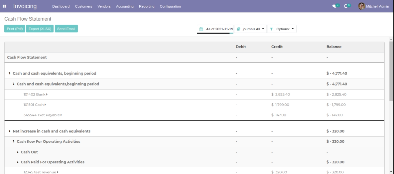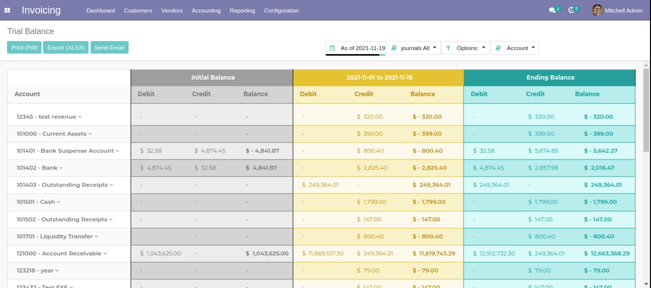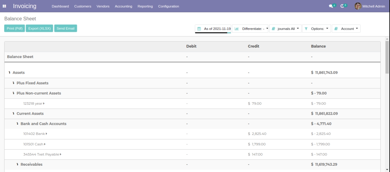 - Journal Filter: The Journals All button provides the option to filter the report based on Bank, Cash, Cash Basis Taxes, Customer Invoices, Exchange Difference, Miscellaneous Operations, Vendor Bills.
