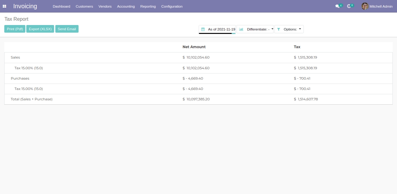 ■ Net Amount in Tax Report - Showing Sales and Purchase Net Amount and Tax, Also total of sales and purchase together as a Total Line