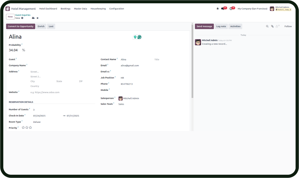 - Quickly capture guest inquiries with essential details like room type, number of guests, and booking dates to create and manage leads efficiently.
