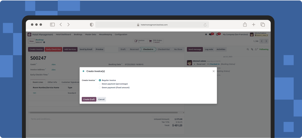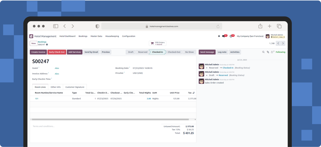 This Odoo hotel management module integrates with Odoo’s Sales, Invoicing, and PoS modules. You can effortlessly combine guests’ room booking charges and service orders to create the final bill at the checkout.