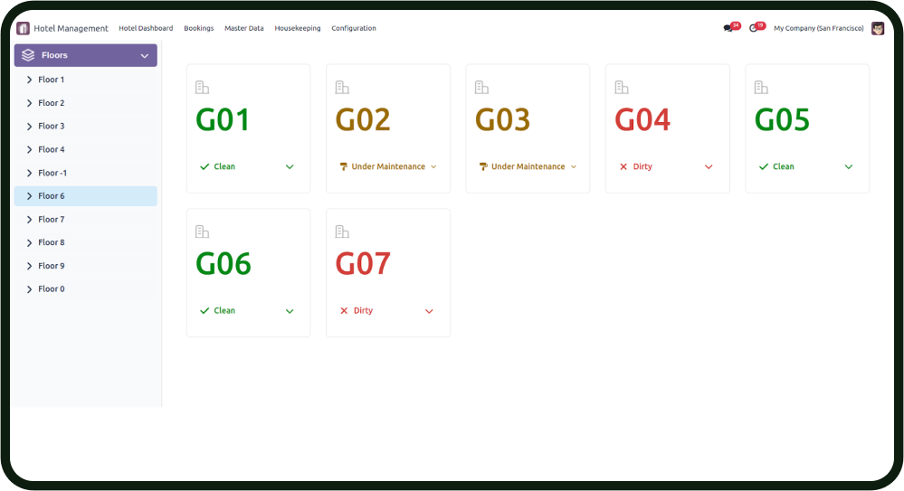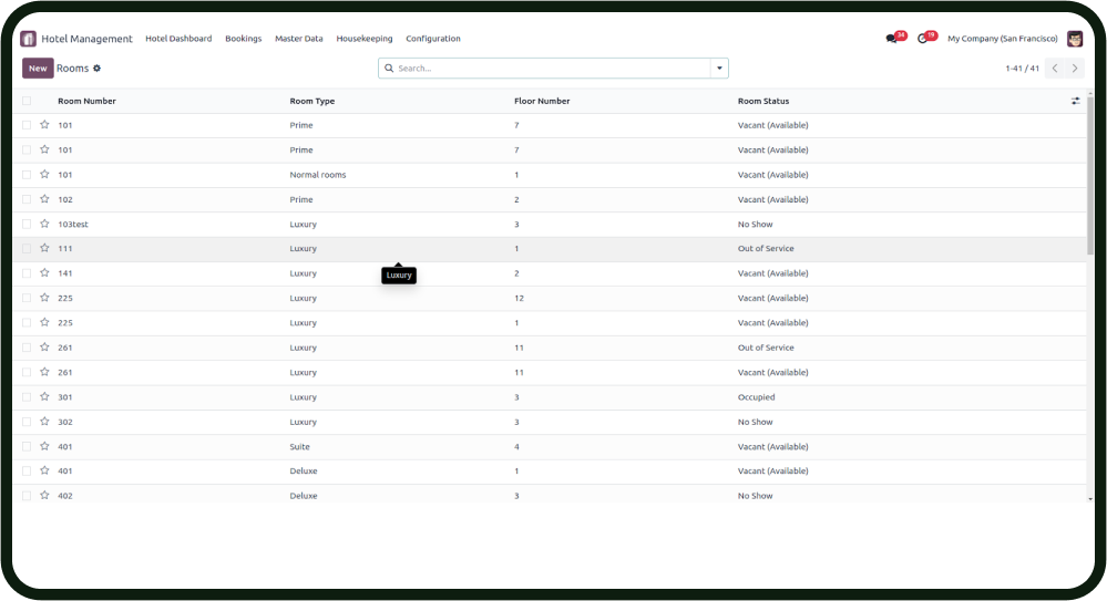 - Easily navigate through the room, room type, and floor information pages to manage and monitor room-related data.