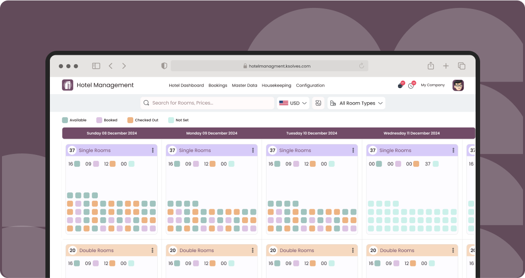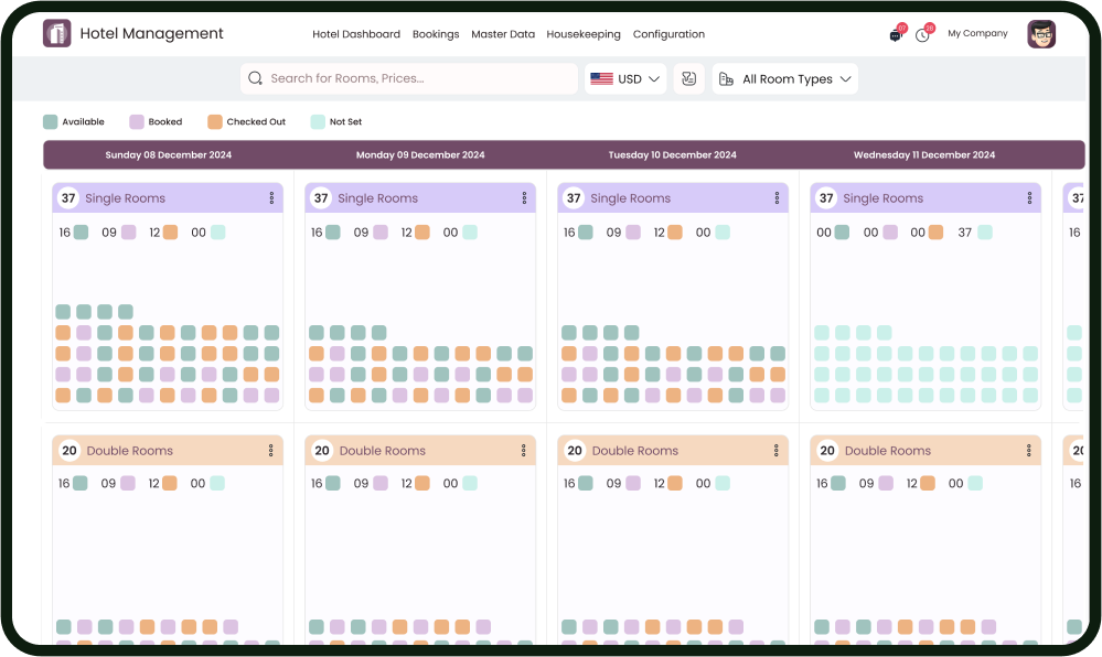 - Monitor room availability with pricing in Gantt view and Calendar view, gaining a clear snapshot of your hotel’s occupancy.